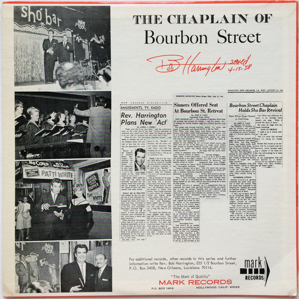 "Rev. Bob Harrington Preaching from the Stage of Bourbon Street's "Sho-Bar" Night Club. And featuring... Youth Choir - First Baptist Church, Milan Tennessee Miss Patti White - Exotic Dancer Sho-Bar Night Club Wally Fowler - Gosper Singer, Nashville Tennessee Earl Williams - Vocalist Sho-Bar Night Club Ronnie Kole - Pianist Kole's Corner'