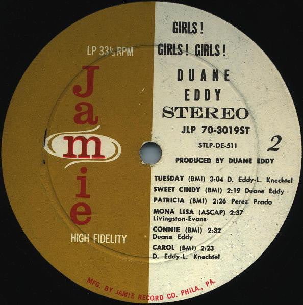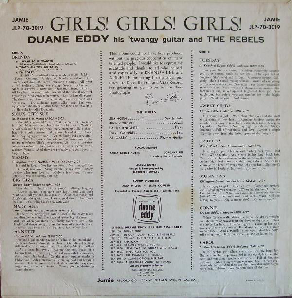 Recorded in Phoenix, Arizona and Nashville, Tenn. High Fidelity Mfg. by Jamie Record Co. Phila., PA. Pressings by Paramount Record Mfg. Co. Inc., Phila. PA. Made/printed in U.S.A. Cat# Sleeve: JLPS 70-3019 Cat# Label : JLP-70-3019ST Artist is listed as 'Duane Eddy His 'Twangy Guitar And The Rebels' on back cover only