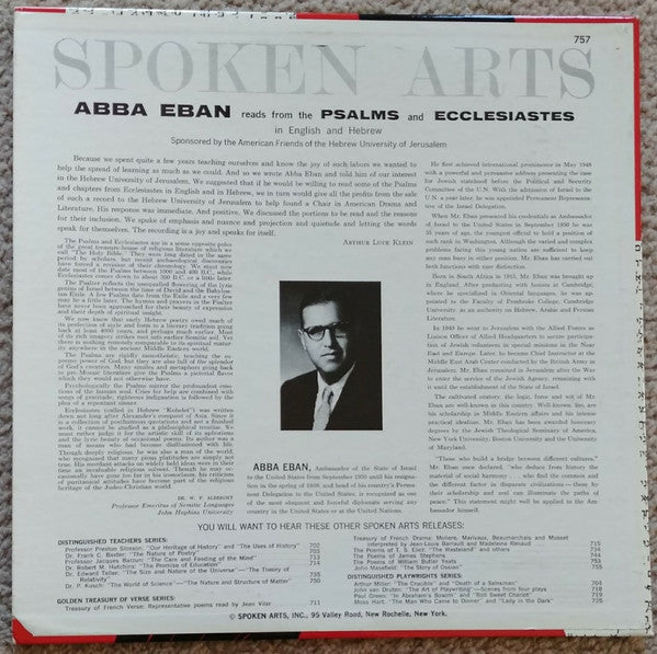 Honorable Abba Eban - Reads From The Psalms Ecclesiastes In English And Hebrew (LP) (VG+ / VG+)