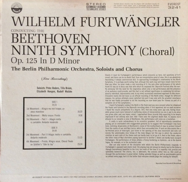 Ludwig van Beethoven - Wilhelm Furtwängler Conducting The Berliner Philharmoniker - Ninth Symphony (Choral) (LP) (VG+ / VG+)